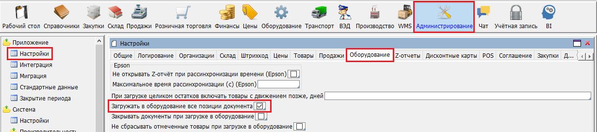 Если в настройках оборудования установлена отметка «Загружать в оборудование все позиции документа» (рис. 2.), то действия для кнопок «Загрузить в оборудование» и «Перегрузить все позиции» одинаковы – в оборудование всегда передается информация по всем позициям документа. В противном случае, по кнопке «Загрузить в оборудование», будут переданы только позиции, по которым изменилась цена с момента последней выгрузки.