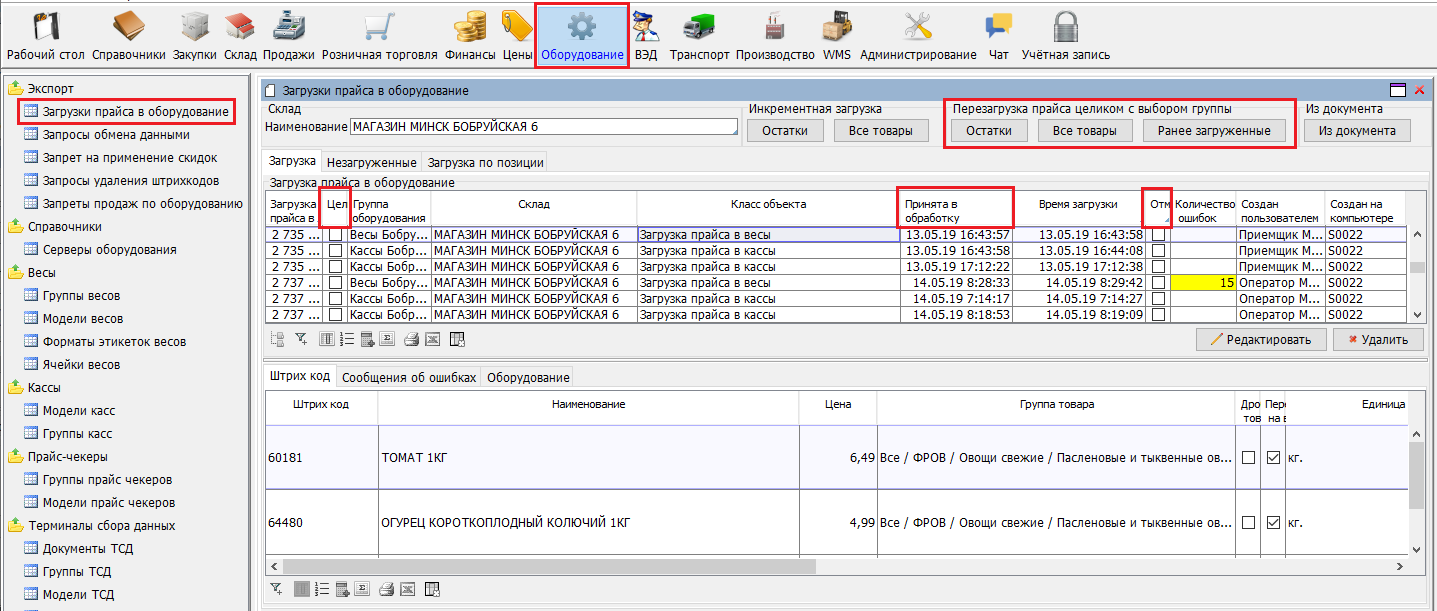 Кнопки «Остатки» и «Все товары» в блоке «Инкрементная загрузка» позволяют передать в оборудование все остатки/товары, у которых текущая цена изменилась с момента последней выгрузки.