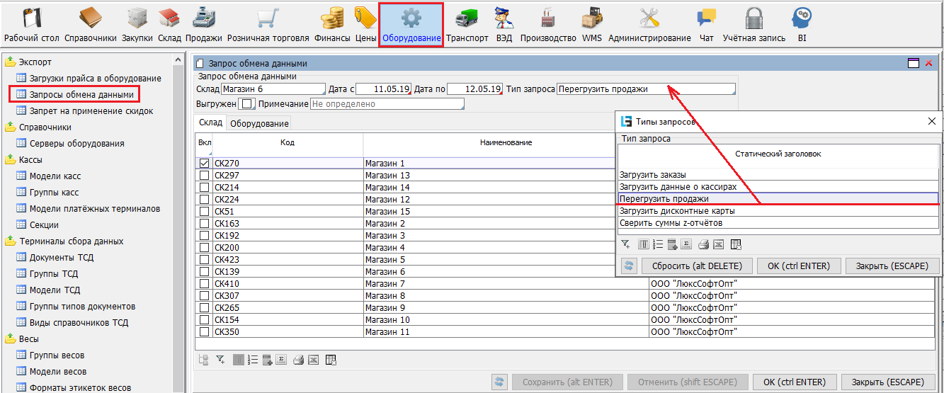 Для создания запроса необходимо указать «Склад» (склады), с оборудование которого будет обмен, «Дата с» и «Дата по» (для типов «Перегрузить продажи или «Сверить суммы z-отчетов»), и «Тип запроса». На вкладке  «Оборудование» указывается оборудование, установленное для выбранного склада (складов).