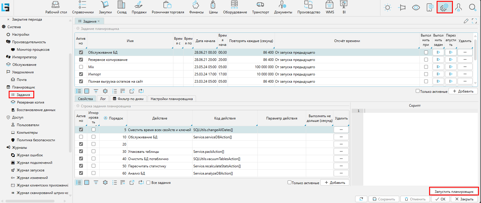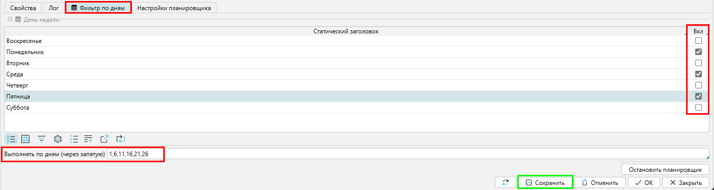 Из данной формы можно осуществлять запуск планировщика по кнопке «Запустить планировщик», либо остановку – «Остановить планировщик» (рис.1.).