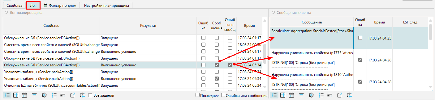 - На вкладке «Лог» можно проследить результаты выполнения Действий: когда оно начато и когда закончено. Если при выполнении Действия возникла ошибка, не позволяющая его завершить, то в логе это отмечено в поле «Ошибка». Некоторые Действия сопровождаются информационными сообщениями – отметка в поле «Сообщения». Если в логе, в поле «Ошибка в сообщениях» есть отметка, это означает, что при выполнении были обнаружены несоответствия некоторым ограничениям, используемым в программе. Все ошибки и сообщения сопровождаются пояснениями в секции «Сообщения клиента» (рис. 2.).