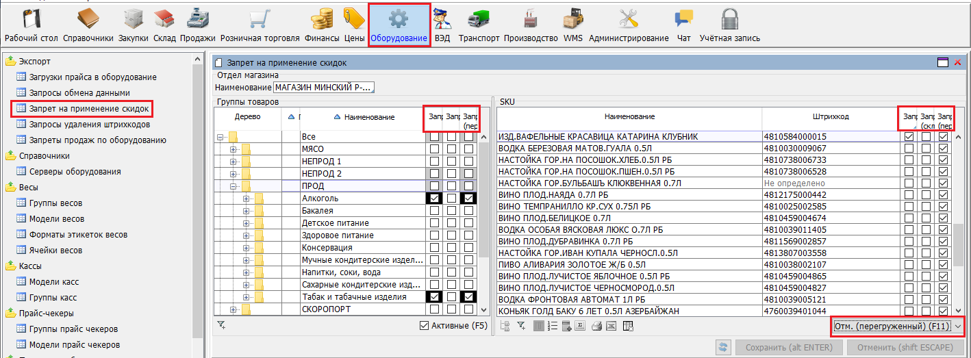 На форме Оборудование\Экспорт\Запрет на применение скидок (рис. 1.) можно определить позиции, для которых продажная цена на кассе не может быть изменена. Запрет может быть установлен как на отдельный товар, так и на группу товара. Установив запрет на группу товара, для всех ее подгрупп и товаров появится отметка «Запрет (перегруженный)», то есть запрет, унаследованный от родительской группы. Отметка «Запрет» будет действовать без привязки к Складу – для всей сети. Отметка «Запрет (склад)» распространяется только на Отдел магазина, указанный в верху формы.