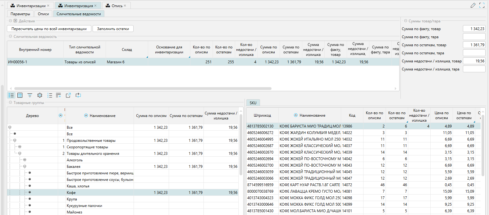 Ручная инвентаризация по нескольким товарам (корректируется кол-во товара из описей, остальные не задействованы)