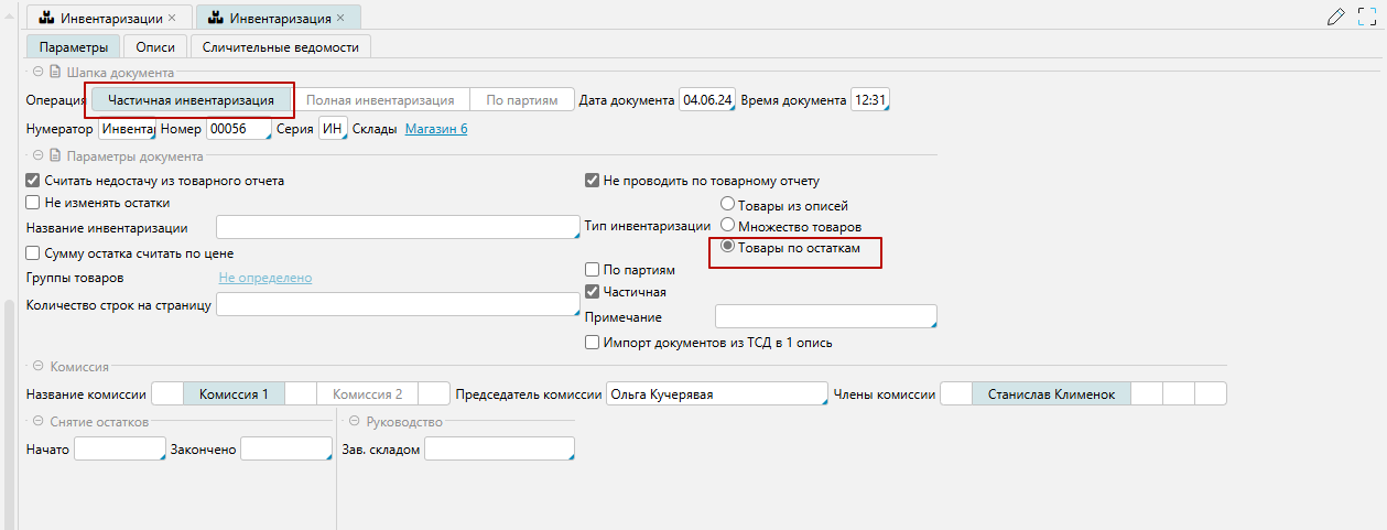 Аналогично проводится полная инвентаризация. В этом случае не выбираются группы и не ставится птичка на "частичная"