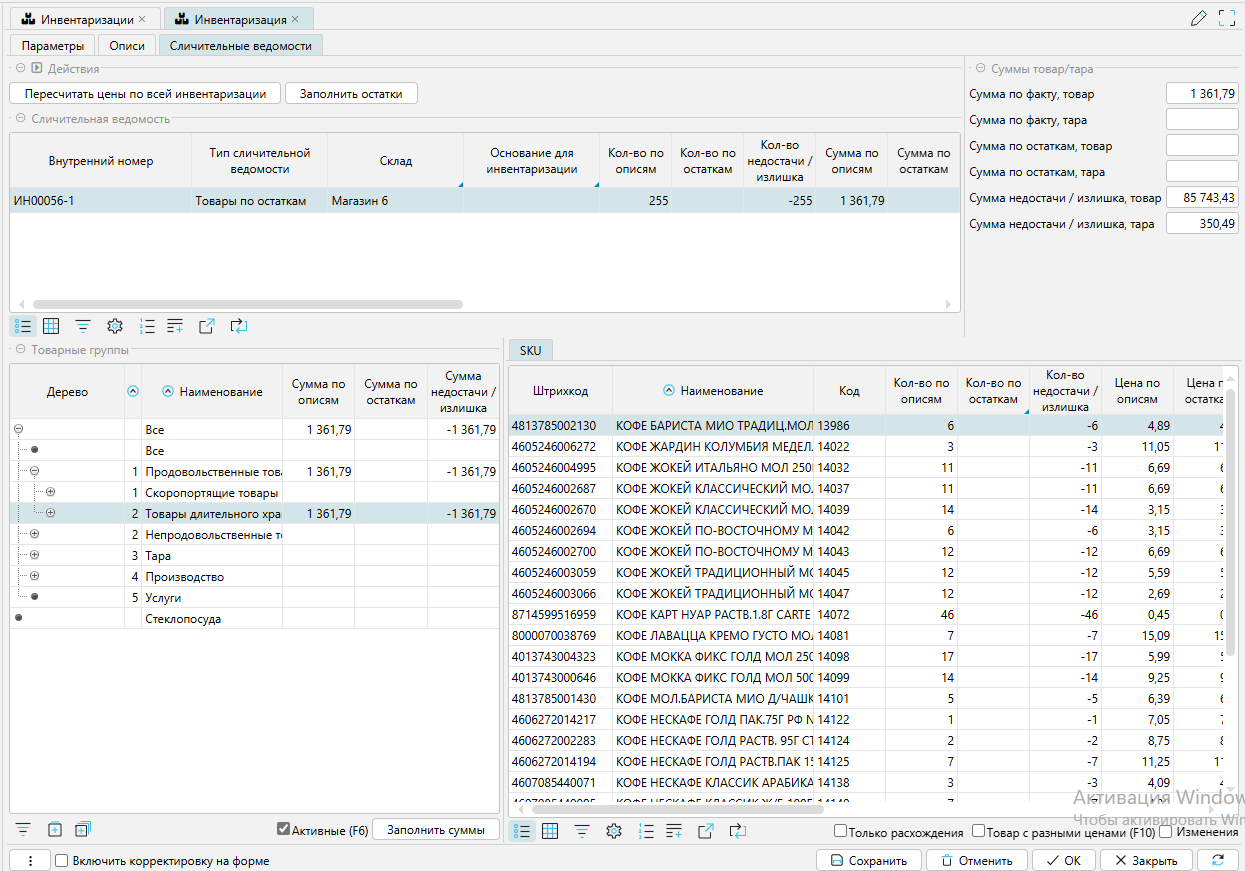 Инвентаризация в пределах одной группы товаров (в соответствии с описями с остатков списывается  недостача, на приход ставится излишек)