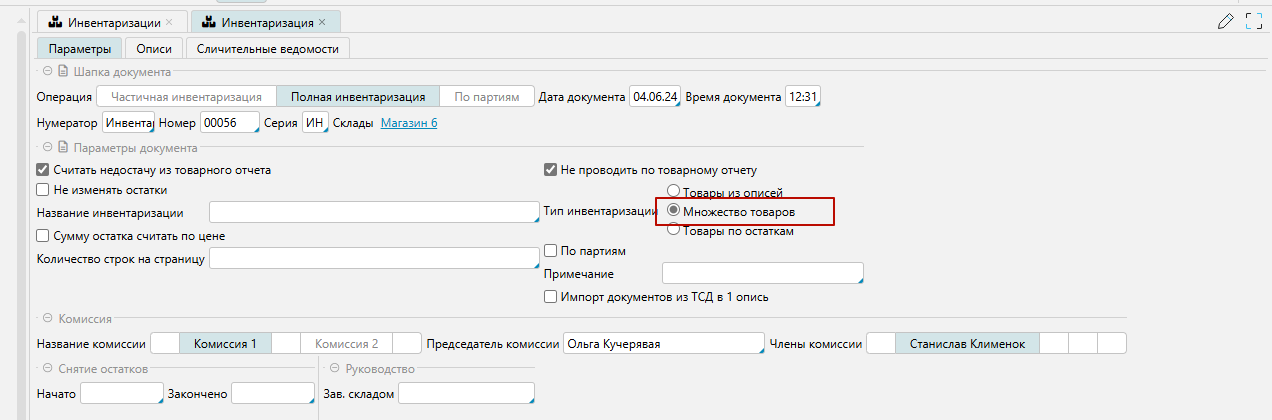 Инвентаризация по нескольким товарам с помощью ТСД (корректируется кол-во товара из описей, остальные не задействованы)