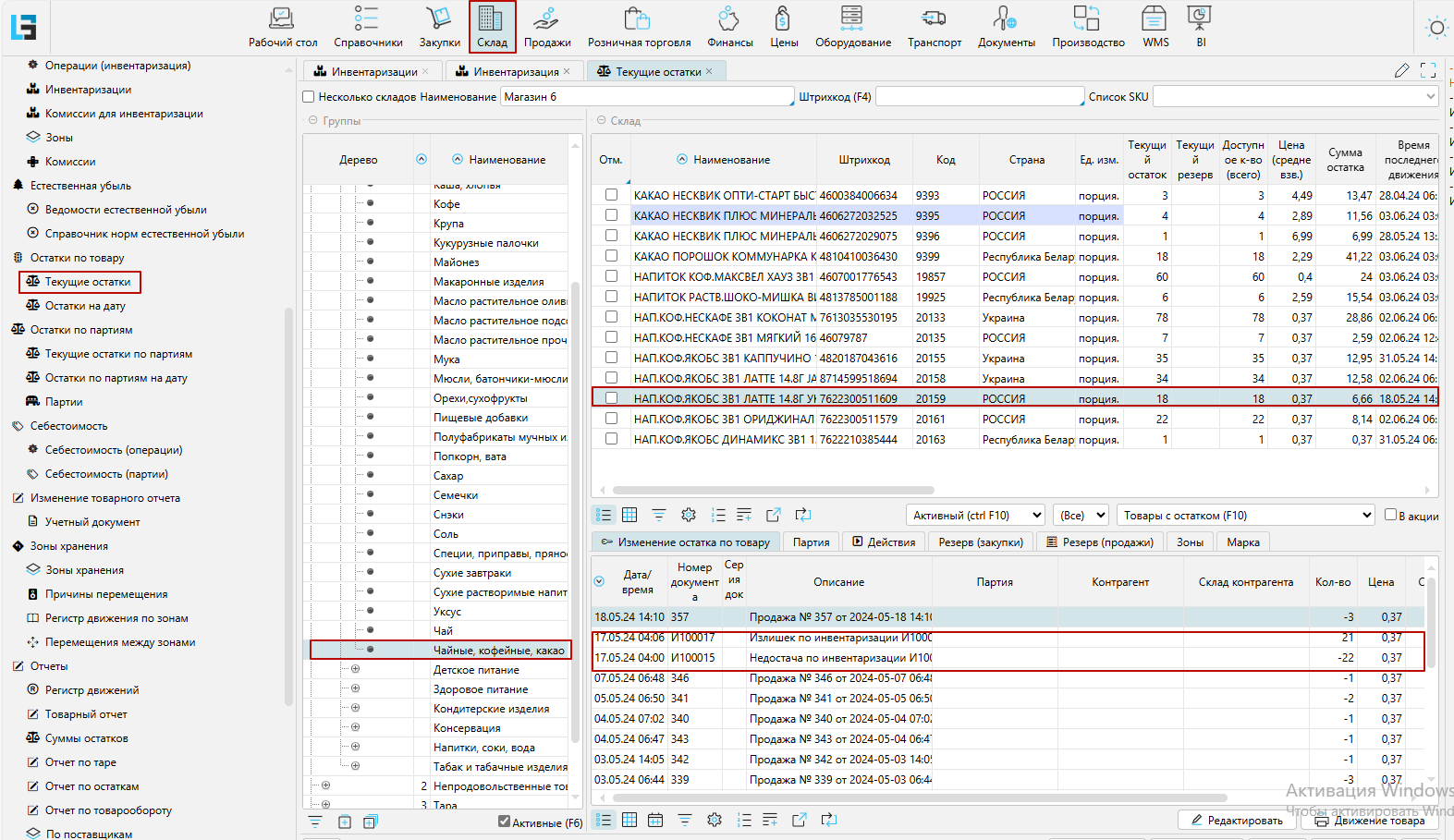 Пример инвентаризации: пересчитан и откорректирован только один товар.