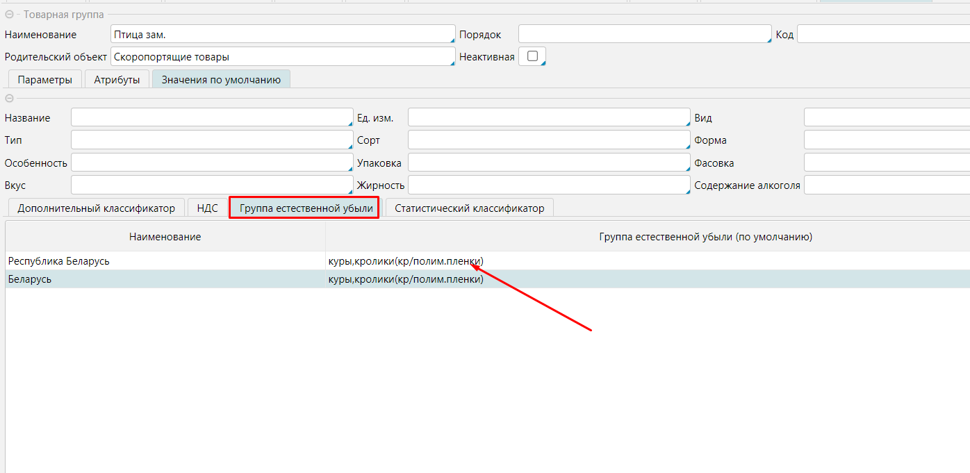 Для товарной группы можно задать группу естественной убыли по умолчанию, которая будет подставляться в карточку товара при выборе товарной группы (Справочники - Товарные группы Редактировать товарную группу).