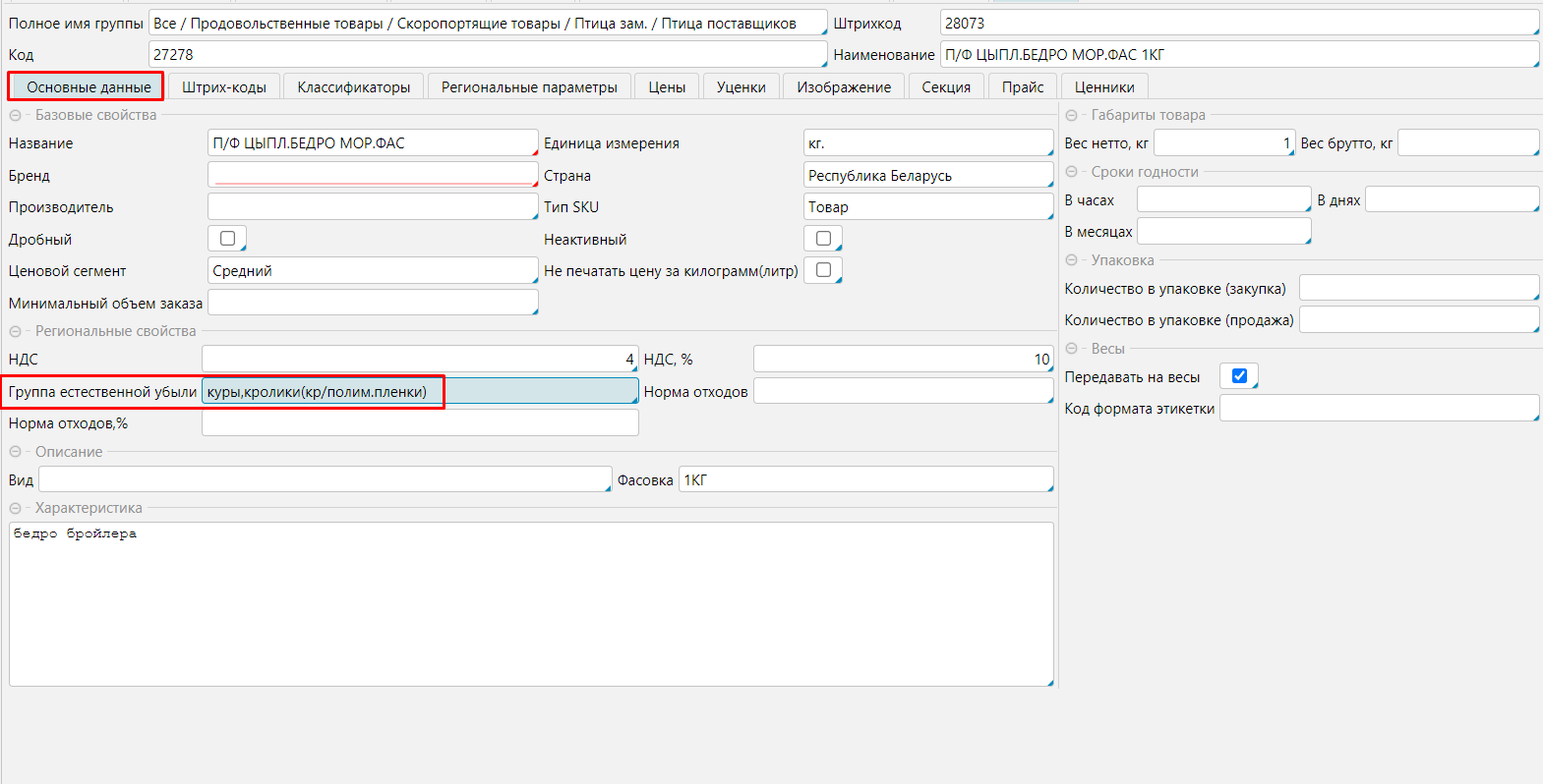 Рис. 4 Группа естественной убыли в товаре вкладка Основные данные