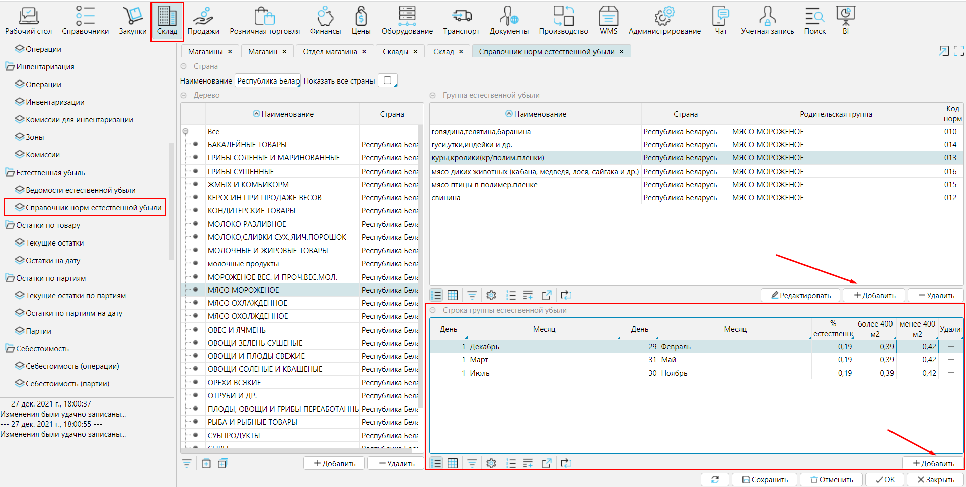 Справочник норм естественной убыли изначально заполняется стандартными данными. В этом справочнике можно добавить или изменить группу естественной убыли. Проценты относительно группы по месяцам (сезонам) вносятся в нижней части справочника для каждого типа склада естественной убыли. Если для склада не указан тип или для типа склада не указан процент убыли, для расчета естественной убыли будут использоваться данные из столбца % естественной убыли: