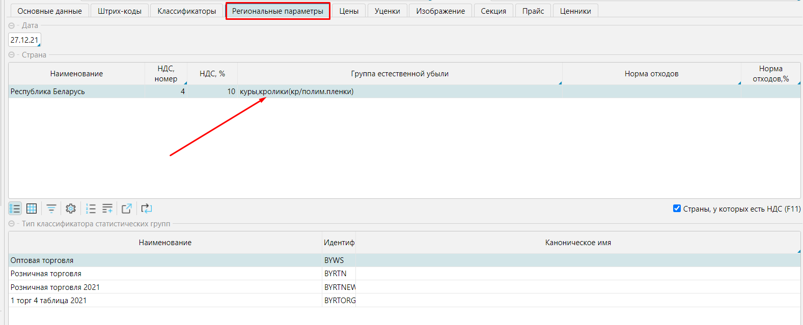 Рис. 5 Группа естественной убыли в товаре вкладка Региональные параметры