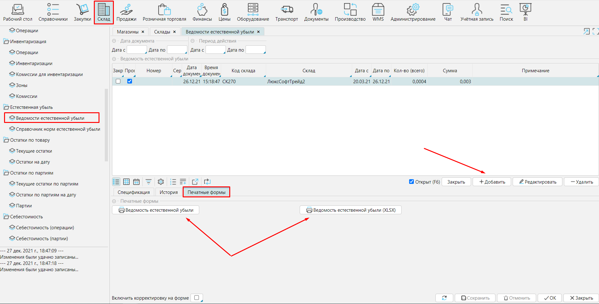 Отчет по естественной убыли формируется на форме Склад - Ведомости естественной убыли. Для формирования отчета нажать кнопку Добавить.