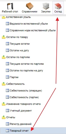 Товарный отчет формируется на форме Склад - Товарный отчет