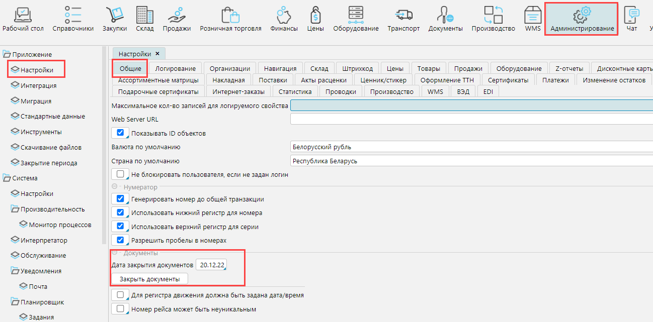 На форме Администрирование - Настройки - Общие необходимо указать Дату закрытия документов и нажать кнопку Закрыть документы. Указанной датой будут закрыты все документы по всем складам.