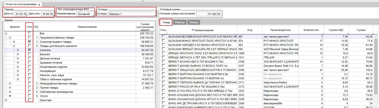 В открывшейся форме необходимо ввести интервал дат, выбрать классификатор и отметить те группы, по которым нужно получить информацию, склад.
