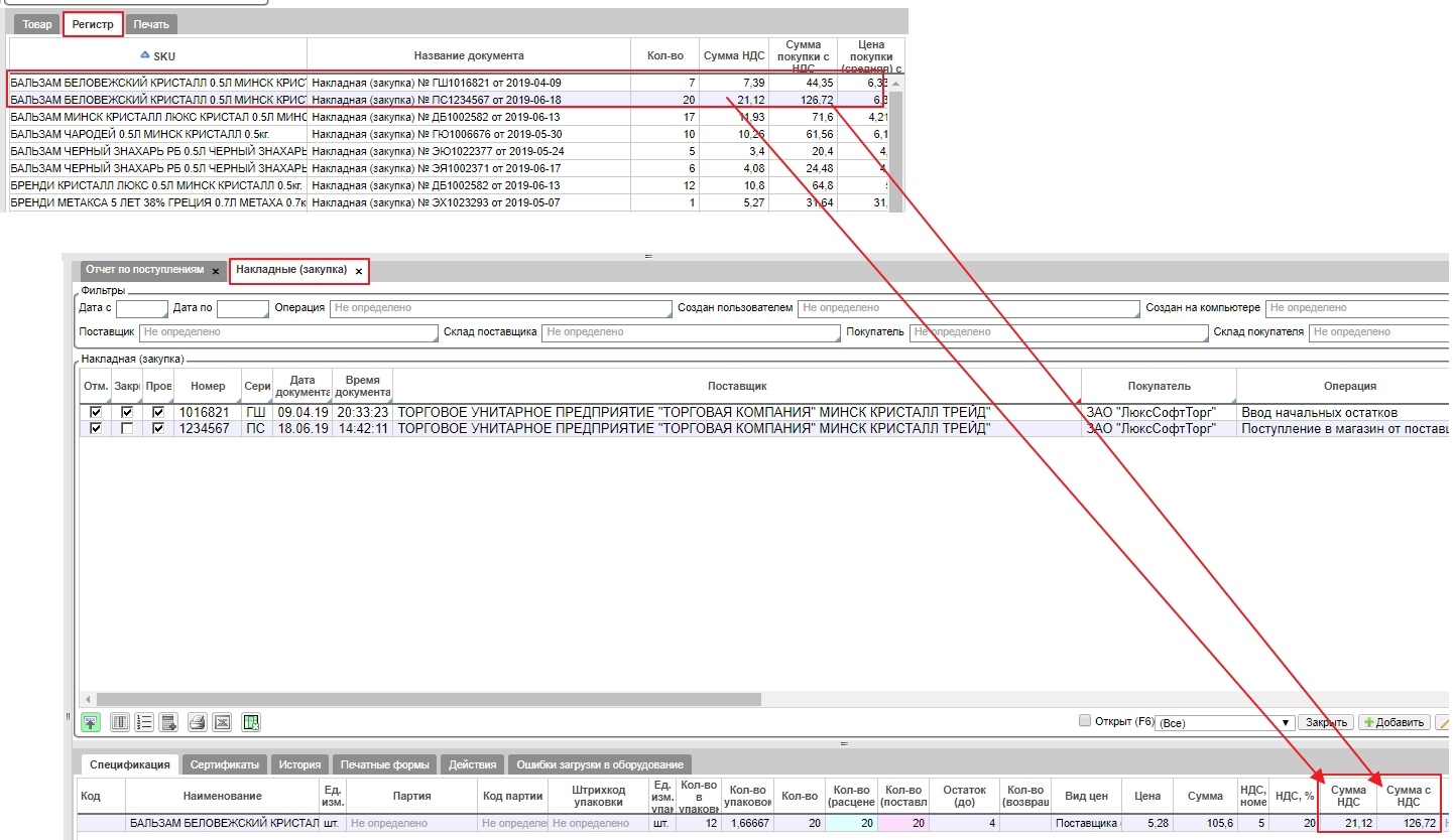 На закладке Регистр можно найти информацию о документах прихода: