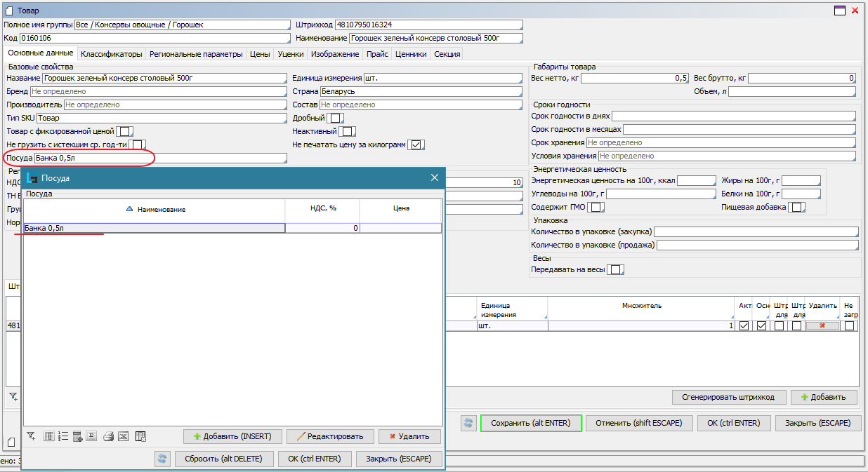 Для внесения товара со стеклопосудой убедитесь, что Посуда привязана к товару.