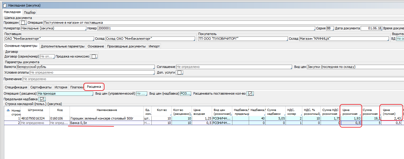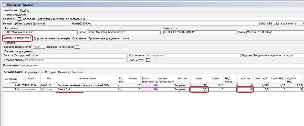 При корректном заполнении товара стеклопосуда появляется второй строкой под основным товаром. Проставляем кол-во банок, цену изготовителя и % НДС при необходимости.