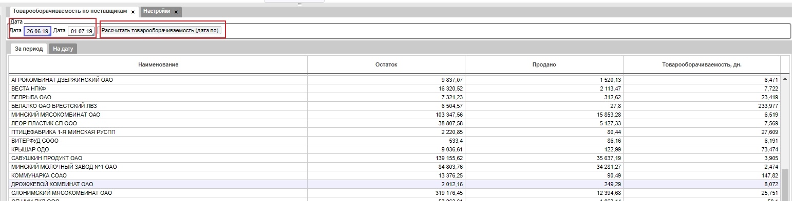 По нажатию кнопки товарооборачиваемость перерассчитывается за кол-во дней указанных в Администрирование - Настройки