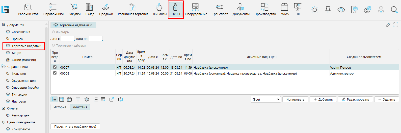 На форме Цены\Документы\Торговые надбавки можно создавать документы, которые будут изменять расчетные виды цен, то есть торговые надбавки с определенной даты.
