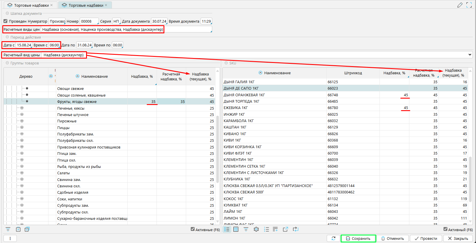При наступлении даты/времени начала действия документа, расчетные виды цен (Цены\Справочники\Виды цен), указанные в поле "Расчетные виды цен", будут изменены на значения из документа при нажатии кнопки Пересчитать надбавки (все). Для автоматического изменения надбавок в соответствии с документом, нужно настроить задание планировщика. Изменения в расчетных видах цен не приводит к автоматическому изменению значения цен (надбавок) в ранее введенных документах.