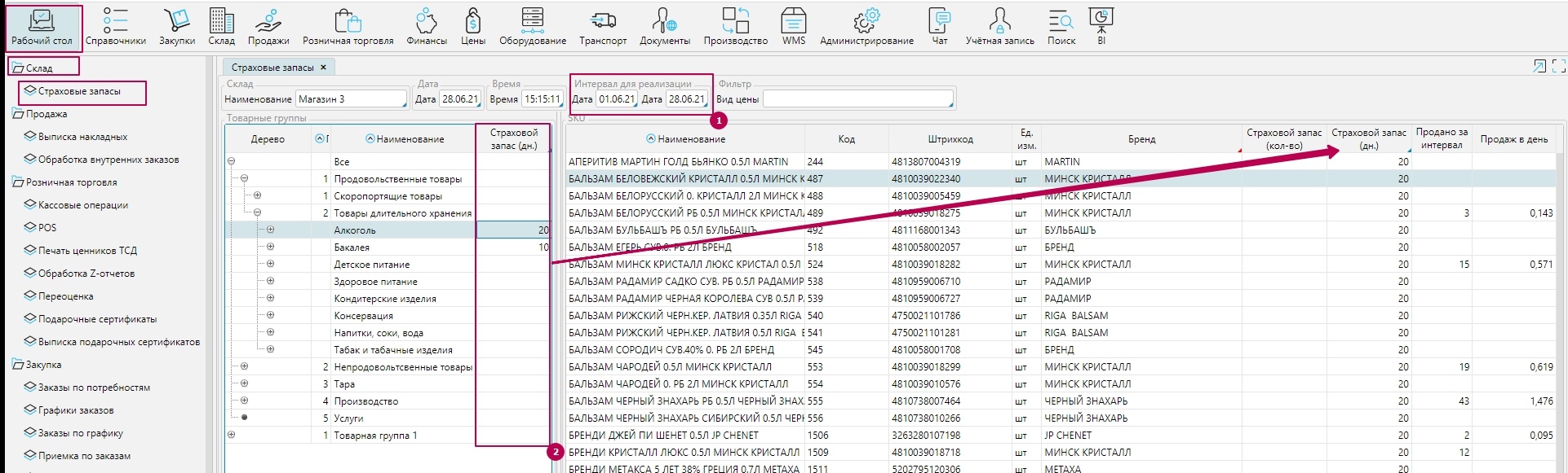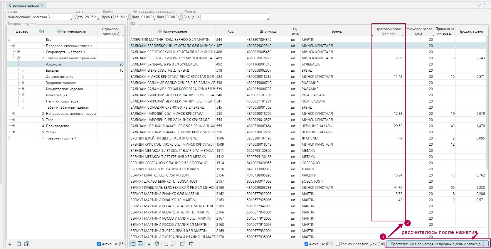 2) указать количество дней, на которое должно хватить запаса - задается либо на уровне товарных групп (колонка "Страховой запас (дн.)" в блоке "Товарные группы"), либо для каждого товара в отдельности (колонка "Страховой запас (дн.)" в блоке "SKU").