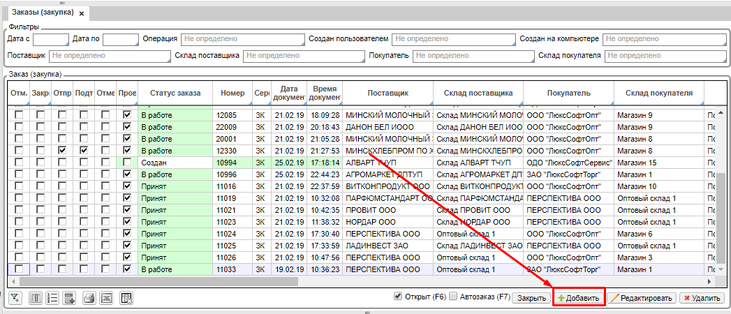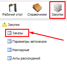 Заходим на форму Заказы - модуль Закупки раздел Закупки.
