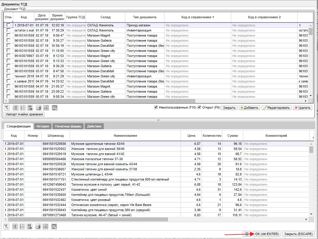При нажатии на которую вызывается форма Документы ТСД, в которой необходимо выбрать документ и нажать кнопку ОК.