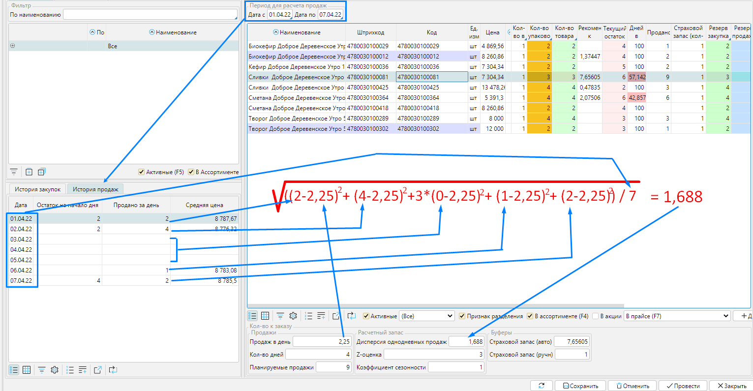Стандартное отклонение однодневных продаж – рассчитывается за период с Текущая дата минус Количество дней для расчета однодневных продаж по Текущая дата минус 1 день.