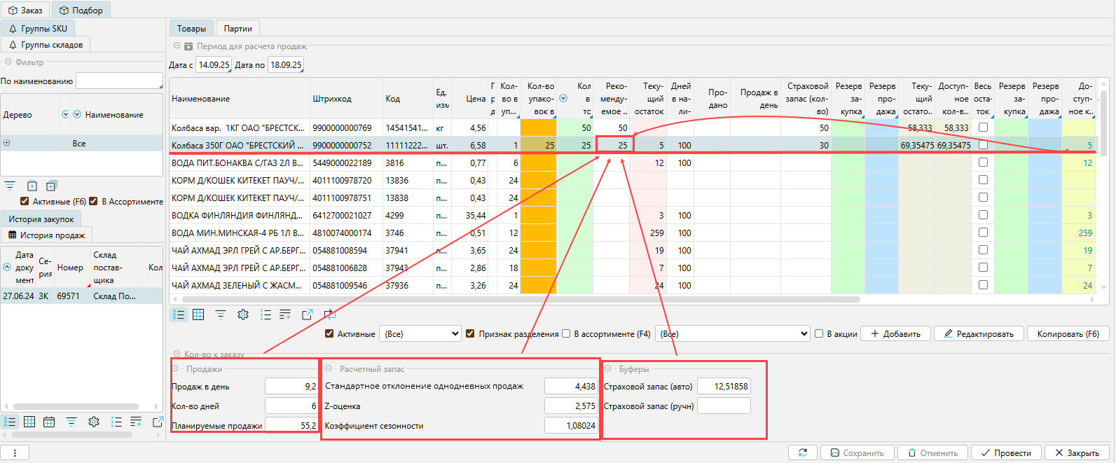 В программе заложен базовый механизм расчета рекомендаций на закупку, который основан на анализе продаж, необходимых страховых запасах, имеющемся остатке и сроков следующей поставки. Данный расчет используется, как при формировании заказов вручную, так и при создании автозаказов (с использованием планировщика). Ряд промежуточных параметров, участвующих в расчете рекомендации можно увидеть при создании заказа, на вкладке Подбор - Товары.