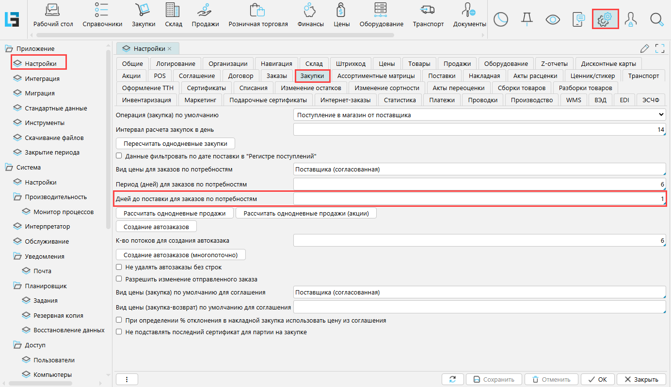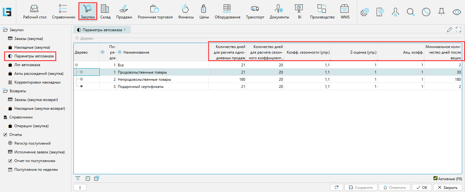 Ряд входных параметров задается на форме Закупки\Закупки\Параметры автозаказа. Параметры могут быть заданы для любого узла основного классификатора товаров.