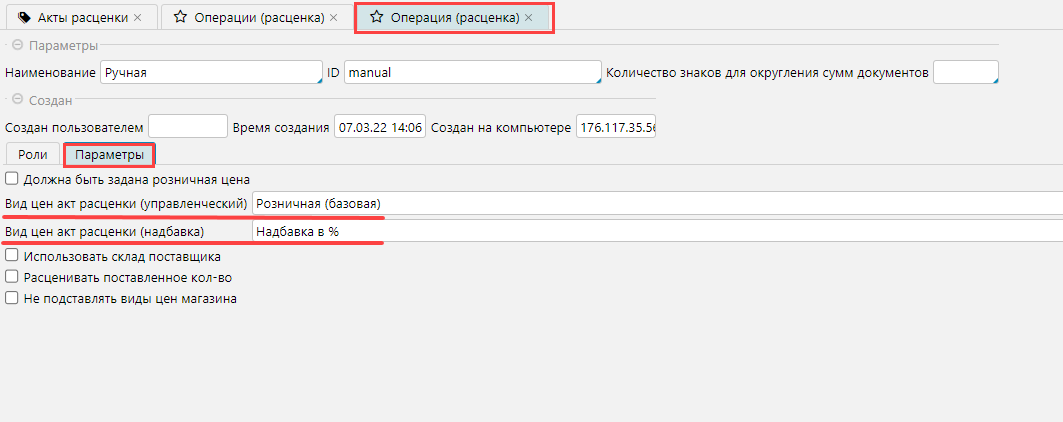 Можно настроить любое количество операций расценки. В операции на вкладке Параметры нужно указать: