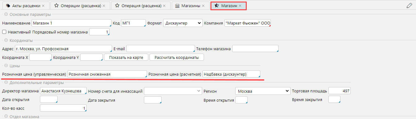 В карточке магазина можно указать виды цен, которые нужно использовать для конкретного магазина.