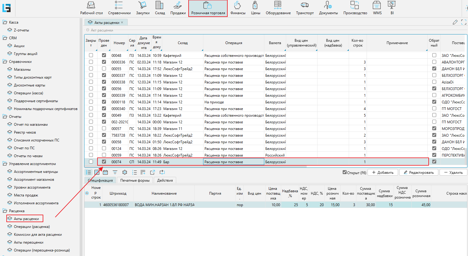 Акты расценки документов Списания формируются, как производные документы (Списание товара/тары по актам, Списание техпотерь и т.д.) и автоматически записываются в журнал Розничная торговля\Акты расценки.