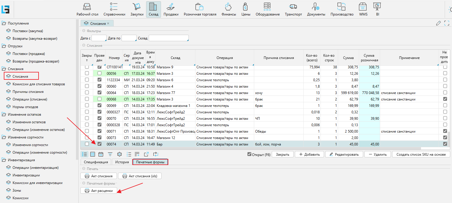 Для печати Акта расценки переходим в закладку Печатные формы в журнале Склад\Списания или