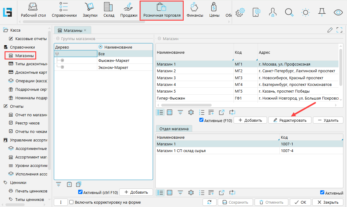 1. На форме Розничная торговля - Магазины выделите магазин и нажмите Редактировать