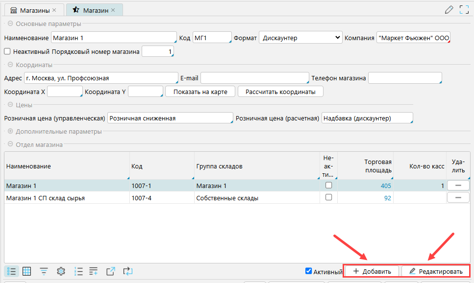 2. На форме магазина выделите отдел и нажмите Редактировать, или нажмите Добавить, чтобы создать новый отдел