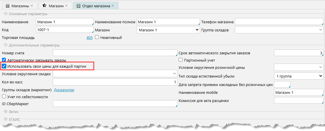 Если ведется строгий партионный учет, механизм использования разных цен для партий одного товара работает по умолчанию. В противном случае признак использования разных цен для партий одного товара указывается для отдела магазина или склада.