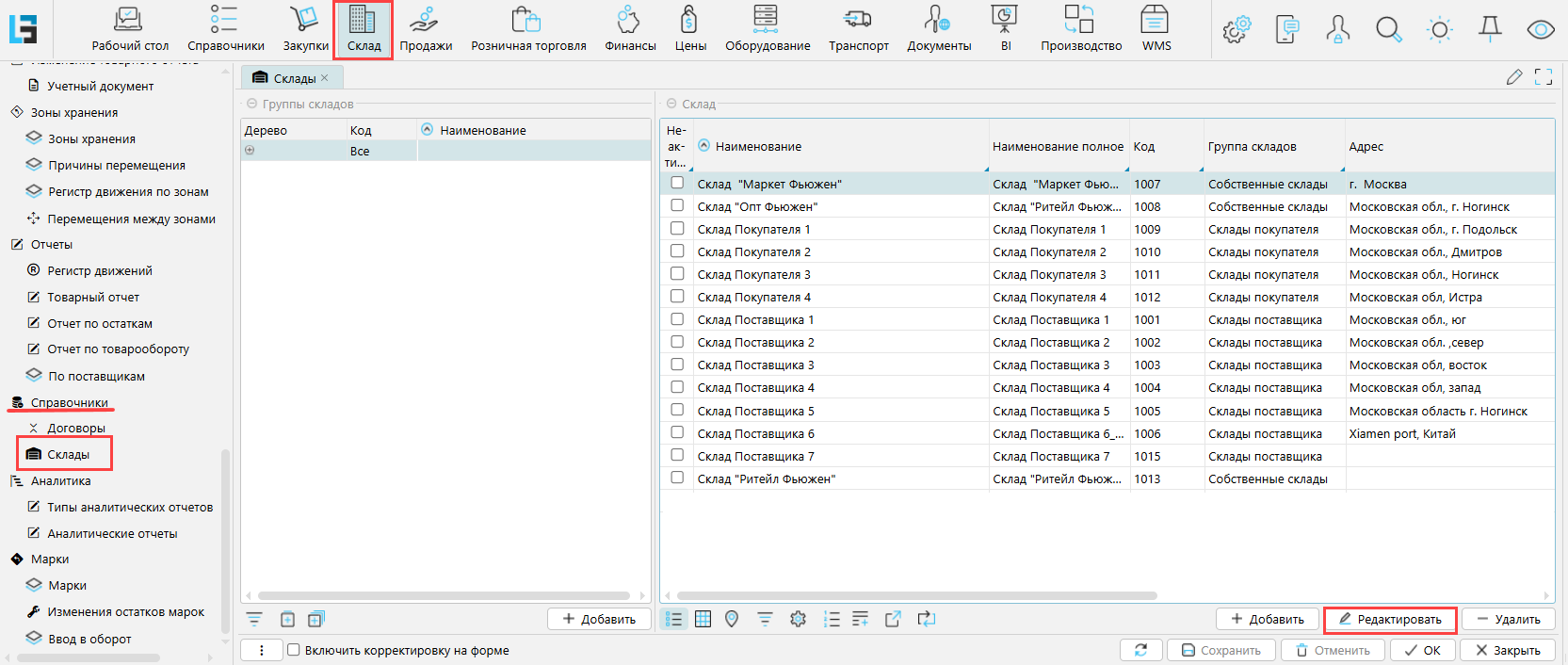 1. На форме Склад - Справочники - Склады выделите курсором склад и нажмите Редактировать.