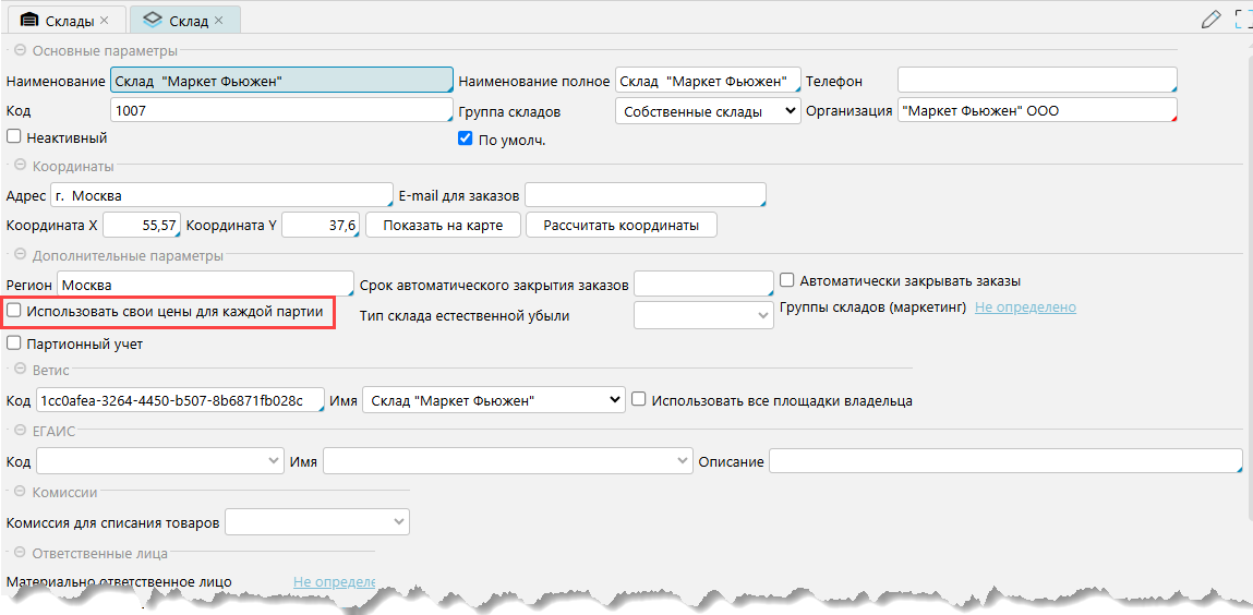 2. На открывшейся форме склада отметьте галочку Использовать свои цены для каждой партии, (если отмечено свойство Партионный учет, то галочка будет недоступна).