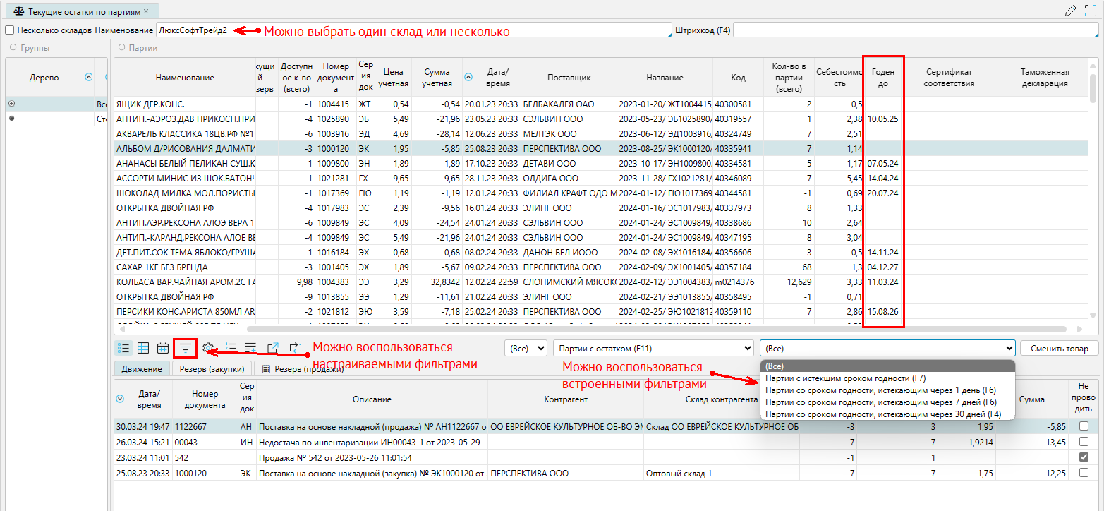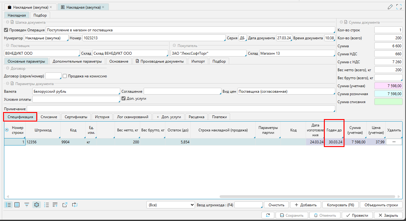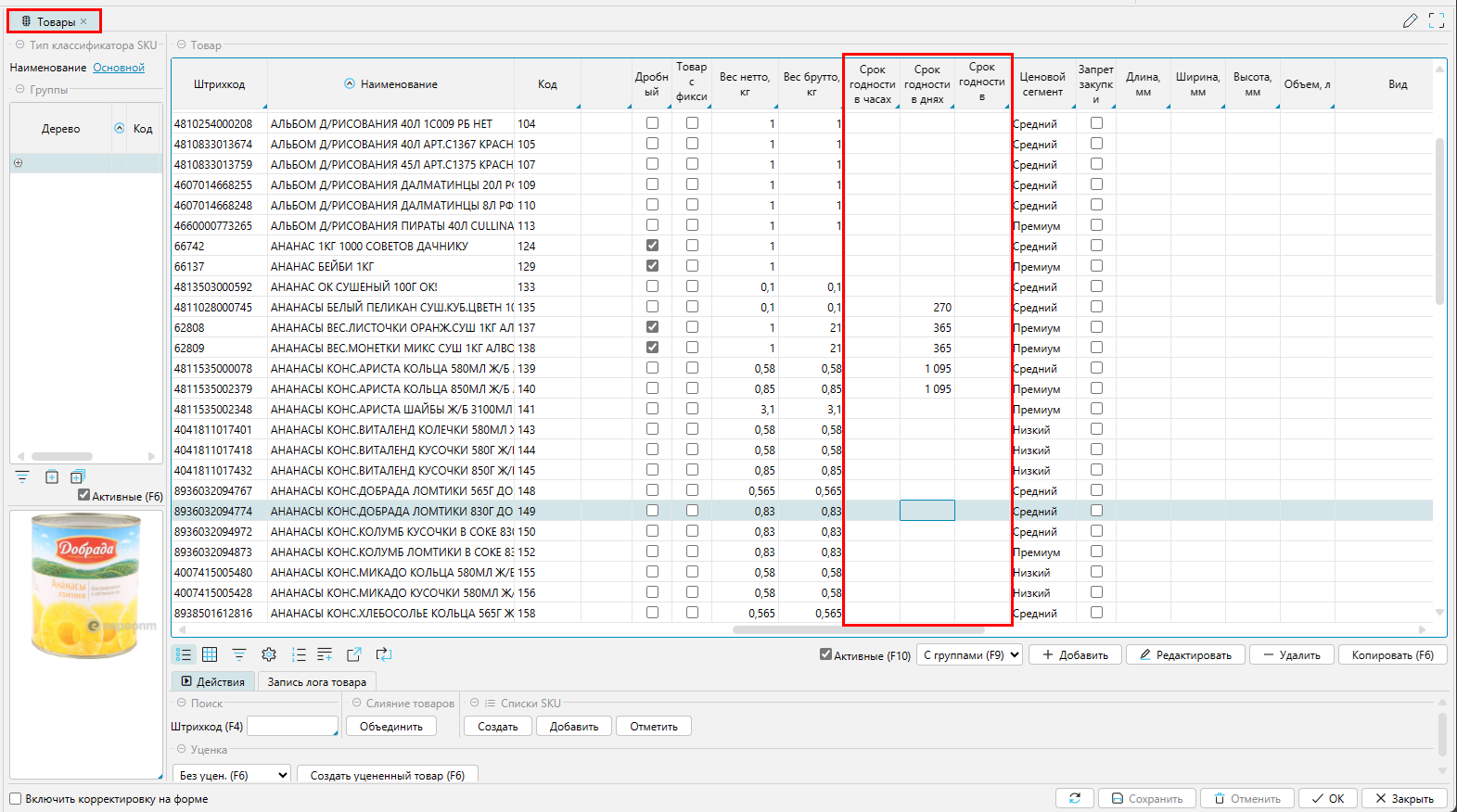 Сроки годности вводятся при вводе приходного документа или он может быть рассчитан исходя из Даты изготовления и кол-ва дней срока хранения в карточке товара.