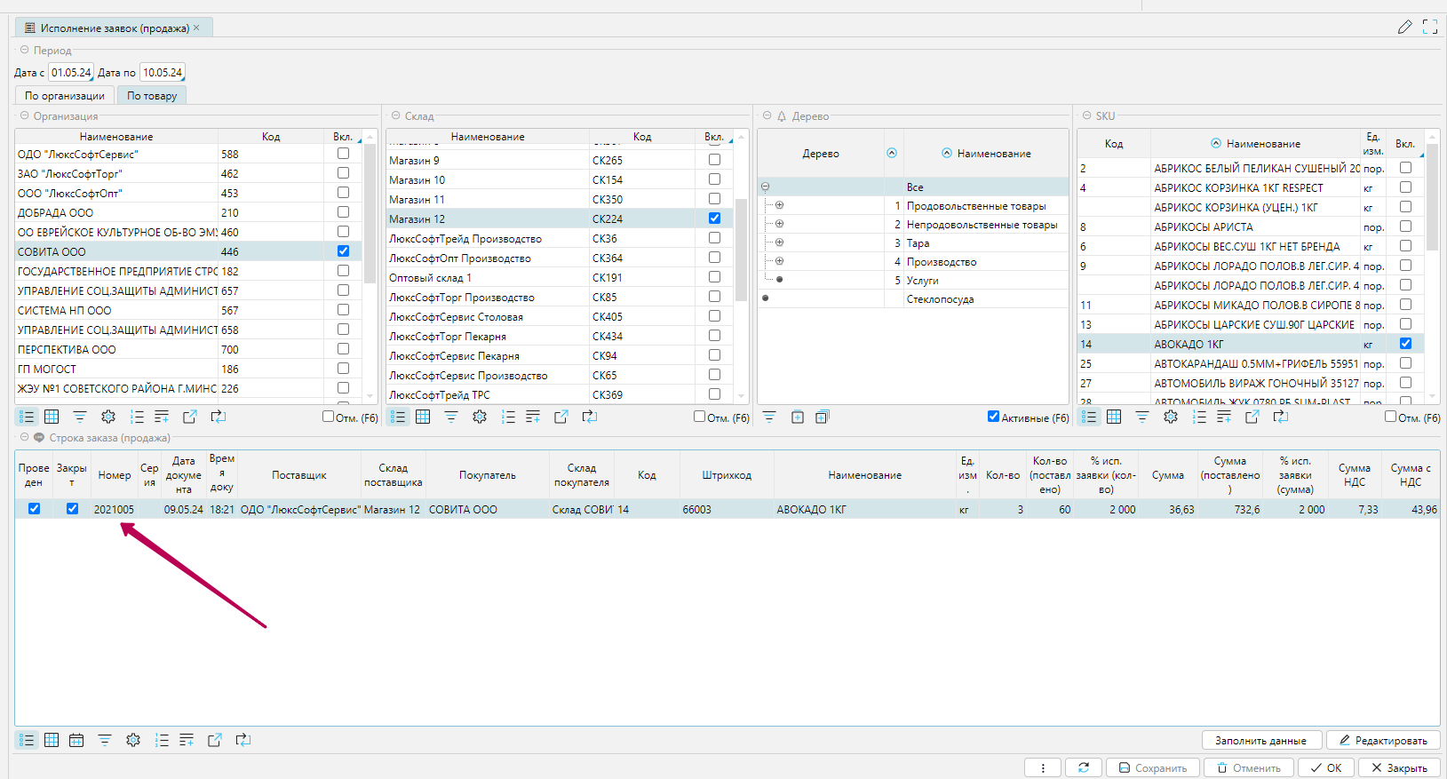 На форме доступны фильтры по организации, складу, группе товаров, товарам. Указав нужные признаки для фильтрации, необходимо нажать кнопку "Заполнить данные". После выполнения в нижней части формы "Строка заказа(продажа)" появится информация.