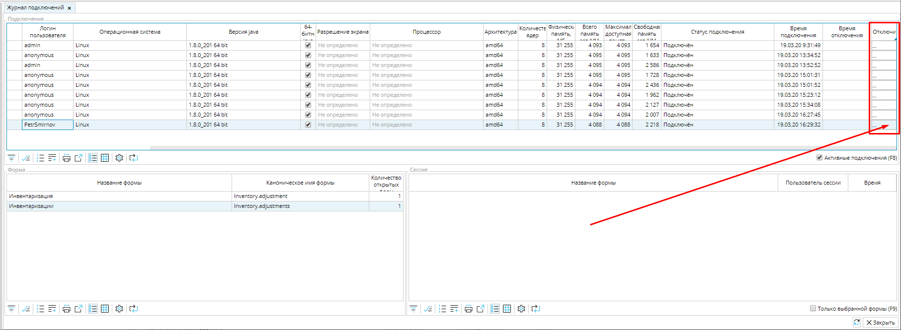 Если сеанс работы пользователя был завершен некорректно, например из-за технических неполадок, сбоев связи или питания, то он может все еще числится активным на сервере приложения (длительность такого периода устанавливается в настройках сервера приложения и по умолчанию составляет 30 минут). При ограниченном количестве одновременных пользователей в такой ситуации может возникнуть необходимость принудительно завершить "зависший" сеанс. Для этого в блоке Подключение формы Журнал подключений необходимо нажать кнопку Отключить для пользователя, завершившего свою рабочую сессию.