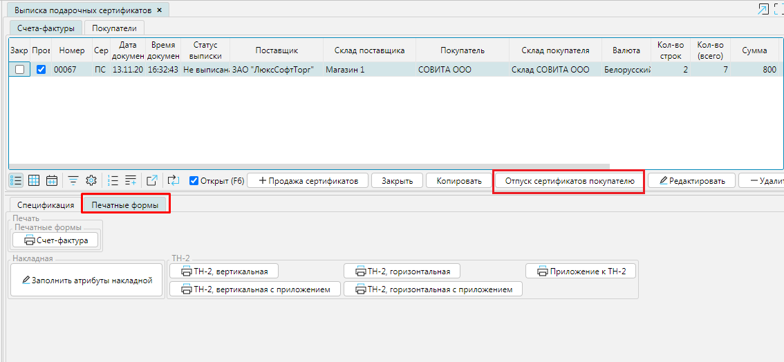 Печать счет-фактуры производится из формы Выписка подарочных сертификатов вкладка Печатные формы.
