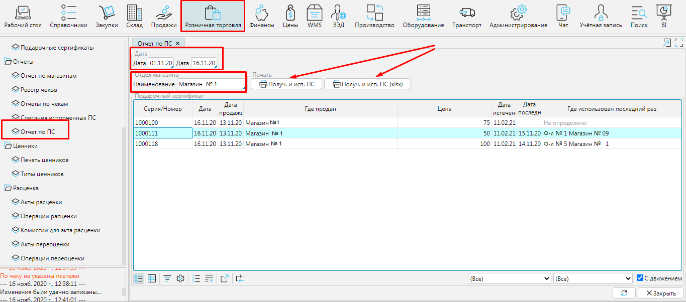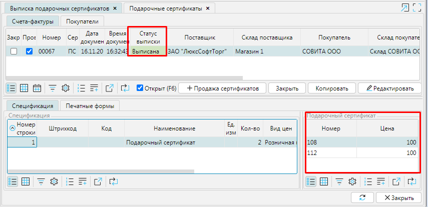 Статус выписки накладной изменится на Выписана, на форме Выписка подарочных сертификатов в блоке Подарочные сертификат отображаются номера проданных сертификатов. На форме Подарочные сертификаты вкладка Сертификаты будет отображена информация о дате и месте продажи сертификатов. При использовании модуля POS lsFusion данные сертификаты уже могут быть использованы для оплаты. При работе c другими системами, могут понадобится дополнительные действия для отправки информации о сертификатах на кассовые серверы.