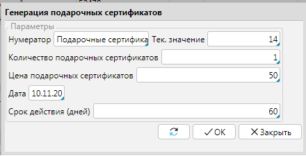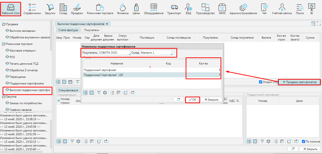 На форме Рабочий стол - Выписка подарочных сертификатов нажать кнопку Продажа сертификатов, в открывшемся окне заполнить данные Покупателя, Склада, указать Количество сертификатов для продажи нужных номиналов, нажать ОК.