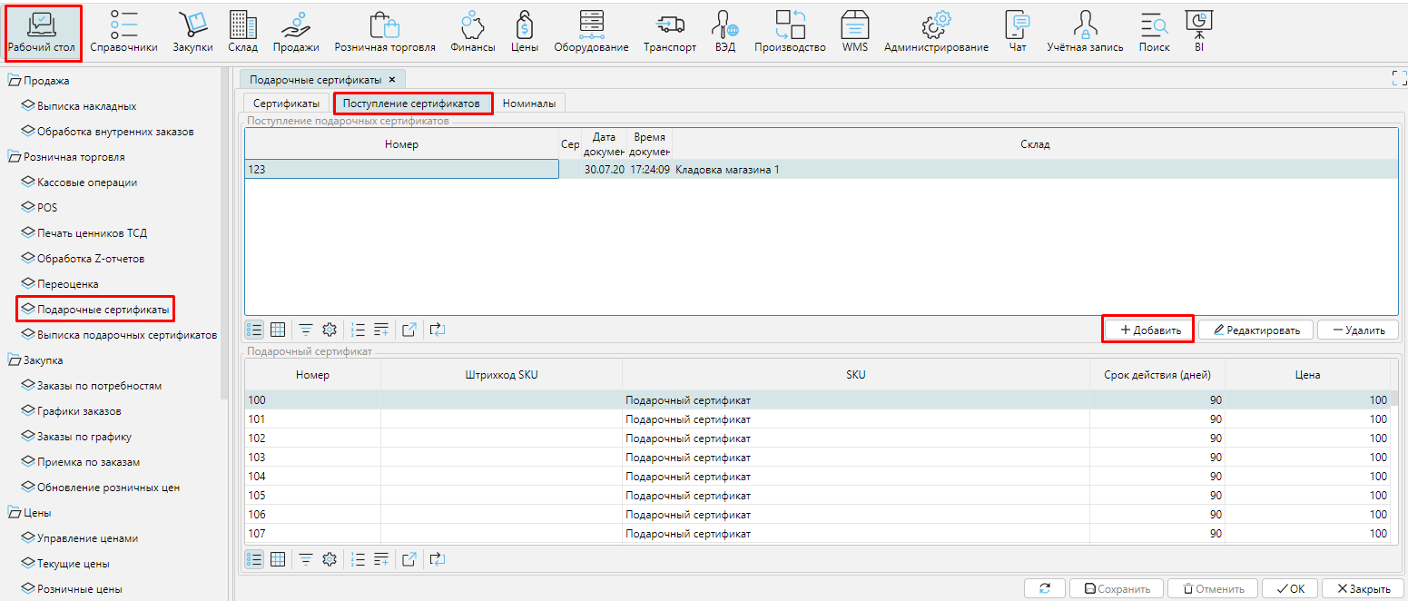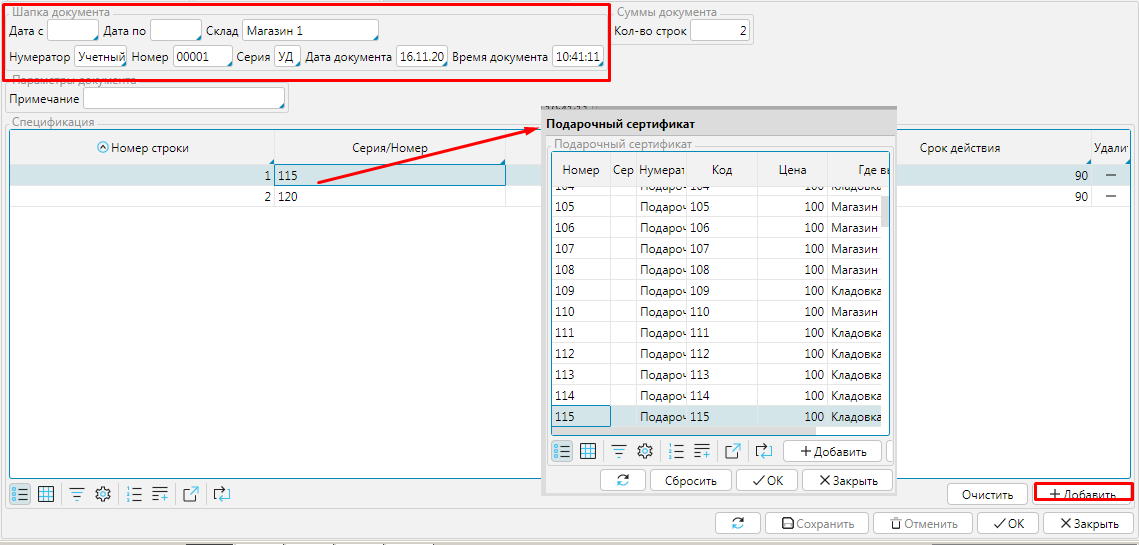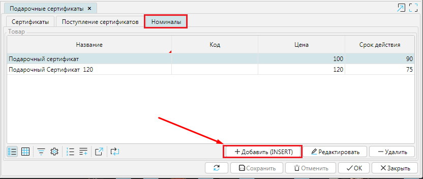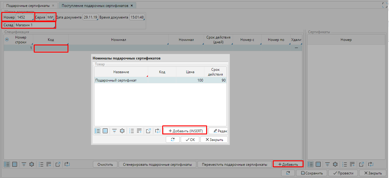 В шапке заполняем Номер, Серию, выбираем магазин (Склад) и нажимаем кнопку Добавить. В спецификации появится пустая строка, в которой необходимо указать номинал сертификата. Для этого в строке нажимаем на поле Код (или Номинал) и выбираем номинал Подарочного Сертификата из доступных. Если нет нужного номинала, необходимо нажать кнопку Добавить и ввести все нужные параметры для нового номинала сертификата.