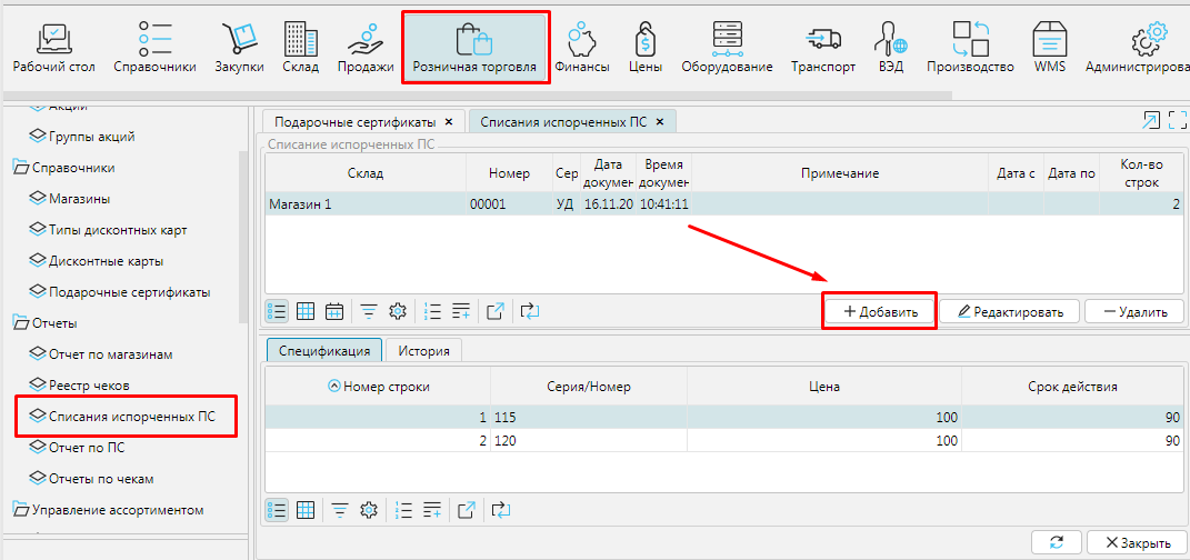 Списание испорченных производится на форме Розничная торговля - Списание испорченных ПС, где отображаются документы списания и номера списанных сертификатов. Чтобы списать ПС необходимо создать новый документ - кнопка Добавить.