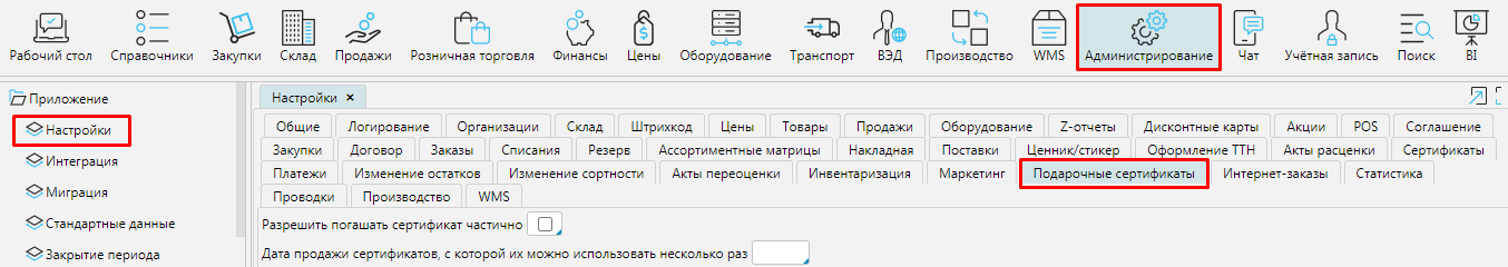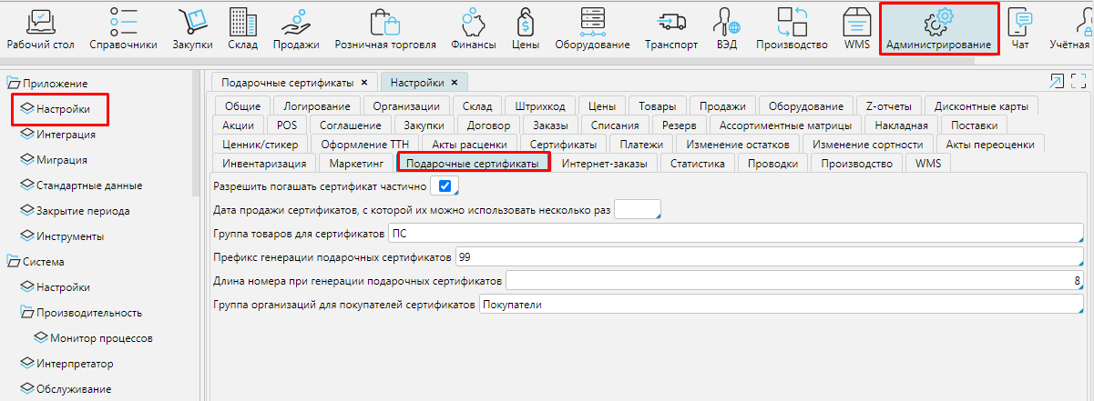В Администрирование - Настройки на вкладке Подарочные сертификаты вводятся первоначальные настройки: