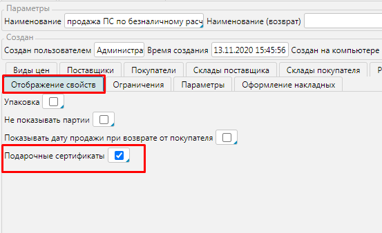 - В настройках операции продажи ПС (Продажи - Справочники/Операции)на вкладке Отображение свойств отметить Подарочные сертификаты.